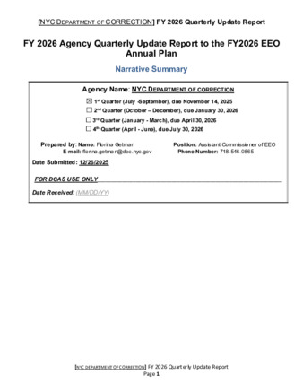 Pursuant to New York City Charter Chapter 35, Section 815(i), and various Local Laws, this report provides information regarding the agency's efforts during the previous quarter to implement a fair and effective affirmative employment plan to provide equal employment opportunity.