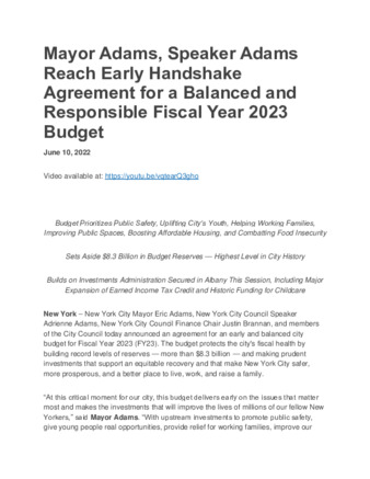 Mayor Adams, Speaker Adams Reach Early Handshake Agreement for a Balanced and Responsible Fiscal Year 2023 Budget