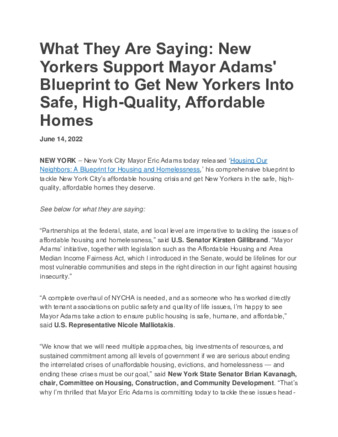 What They Are Saying: New Yorkers Support Mayor Adams' Blueprint to Get New Yorkers Into Safe, High-Quality, Affordable Homes