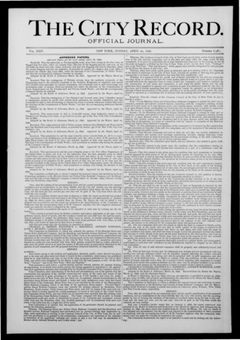 The City Record newspaper publishes notices which includes but is not limited to: public hearings and meetings, public auctions and sales, solicitations and awards and official rules proposed and adopted by city agencies. This is the City Record Newspaper for April 20, 1896.