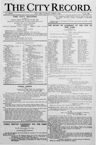 The City Record newspaper publishes notices which includes but is not limited to: public hearings and meetings, public auctions and sales, solicitations and awards and official rules proposed and adopted by city agencies. This is the City Record Newspaper for March 04, 1909.