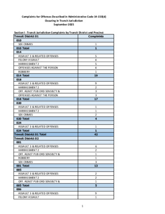 Pursuant to Admin Code Sect. 14-150(d), this monthly report contains information on complaints and arrests for violent felony offenses, assault, sex offenses, disorderly conduct, harassment, aggravated harassment, and offenses against public sensibilities that occurred in transit