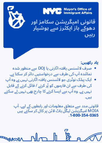 Flyer for immigrant community members warning that only a licensed attorney or a DOJ Accredited Representative can file applications on your behalf. A public notary who is not a licensed attorney is unable to fill out these forms/file them on your behalf. They also cannot charge you to do this.