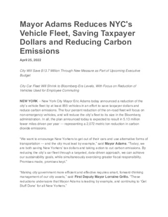 Mayor Adams Reduces NYC's Vehicle Fleet, Saving Taxpayer Dollars and Reducing Carbon Emissions