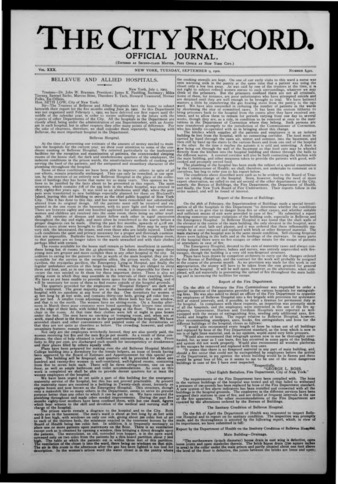 The City Record newspaper publishes notices which includes but is not limited to: public hearings and meetings, public auctions and sales, solicitations and awards and official rules proposed and adopted by city agencies. This is the City Record Newspaper for September 09, 1902.