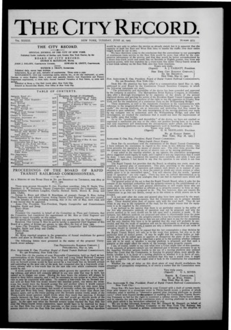 The City Record newspaper publishes notices which includes but is not limited to: public hearings and meetings, public auctions and sales, solicitations and awards and official rules proposed and adopted by city agencies. This is the City Record Newspaper for June 27, 1905.