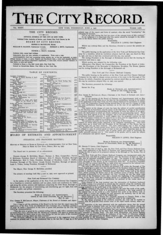 The City Record newspaper publishes notices which includes but is not limited to: public hearings and meetings, public auctions and sales, solicitations and awards and official rules proposed and adopted by city agencies. This is the City Record Newspaper for June 05, 1907.
