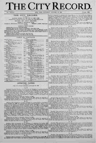 The City Record newspaper publishes notices which includes but is not limited to: public hearings and meetings, public auctions and sales, solicitations and awards and official rules proposed and adopted by city agencies. This is the City Record Newspaper for January 30, 1909.