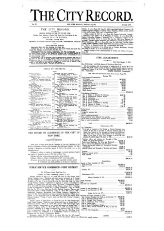 The City Record newspaper publishes notices which includes but is not limited to: public hearings and meetings, public auctions and sales, solicitations and awards and official rules proposed and adopted by city agencies. This is the City Record Newspaper for January 22, 1912.