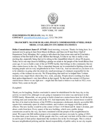 Press Release: TRANSCRIPT: MAYOR DE BLASIO, POLICE COMMISSIONER O’NEILL HOLD MEDIA AVAILABILITY ON CRIME STATISTICS