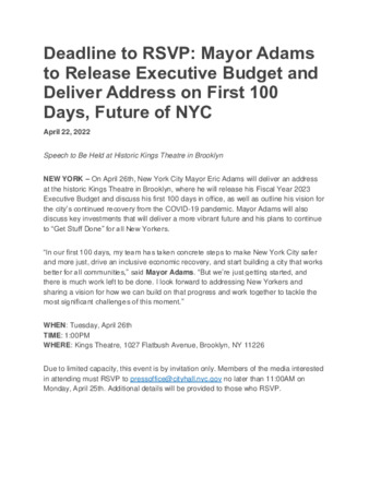 Deadline to RSVP: Mayor Adams to Release Executive Budget and Deliver Address on First 100 Days, Future of NYC