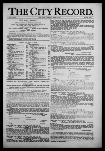 The City Record newspaper publishes notices which includes but is not limited to: public hearings and meetings, public auctions and sales, solicitations and awards and official rules proposed and adopted by city agencies. This is the City Record Newspaper for May 22, 1906.