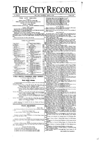 The City Record newspaper publishes notices which includes but is not limited to: public hearings and meetings, public auctions and sales, solicitations and awards and official rules proposed and adopted by city agencies. This is the City Record Newspaper for March 16, 1910.