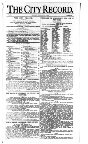 The City Record newspaper publishes notices which includes but is not limited to: public hearings and meetings, public auctions and sales, solicitations and awards and official rules proposed and adopted by city agencies. This is the City Record Newspaper for May 02, 1912.