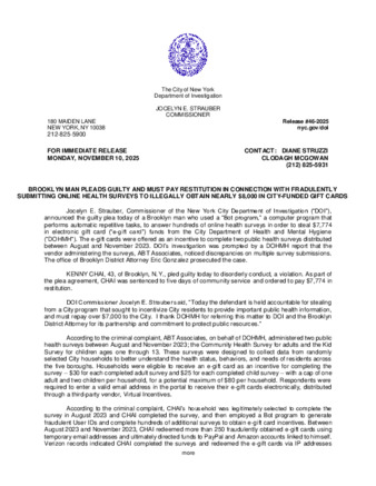 Jocelyn E. Strauber, Commissioner of the New York City Department of Investigation (“DOI”), announced the guilty plea today of a Brooklyn man who used a “Bot program,” a computer program that performs automatic repetitive tasks, to answer hundreds of online health surveys in order to steal $7,774.