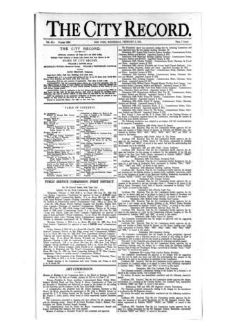 The City Record newspaper publishes notices which includes but is not limited to: public hearings and meetings, public auctions and sales, solicitations and awards and official rules proposed and adopted by city agencies. This is the City Record Newspaper for February 05, 1913.