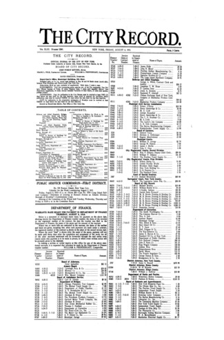The City Record newspaper publishes notices which includes but is not limited to: public hearings and meetings, public auctions and sales, solicitations and awards and official rules proposed and adopted by city agencies. This is the City Record Newspaper for August 06, 1915.