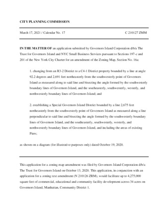 IN THE MATTER OF an application submitted by Governors Island Corporation d/b/a The Trust for Governors Island and NYC Small Business Services pursuant to Sections 197-c and 201 of the New York City Charter for an amendment of the Zoning Map, Section No. 16a: 1. changing from an R3-2 District to etc