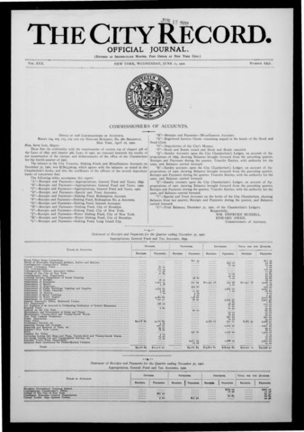 The City Record newspaper publishes notices which includes but is not limited to: public hearings and meetings, public auctions and sales, solicitations and awards and official rules proposed and adopted by city agencies. This is the City Record Newspaper for June 11, 1902.