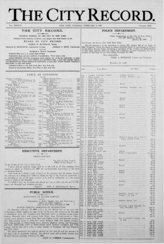 The City Record newspaper publishes notices which includes but is not limited to: public hearings and meetings, public auctions and sales, solicitations and awards and official rules proposed and adopted by city agencies. This is the City Record Newspaper for February 09, 1909.