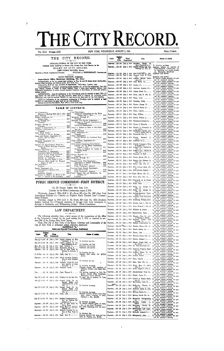 The City Record newspaper publishes notices which includes but is not limited to: public hearings and meetings, public auctions and sales, solicitations and awards and official rules proposed and adopted by city agencies. This is the City Record Newspaper for August 05, 1914.