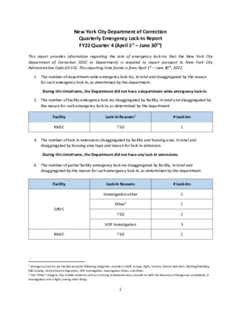 Pursuant to the local law this report provides information related to on emergency lock-ins within city jail facilities, including the number of lock-ins, duration of lock-ins, and programming and service interruptions.