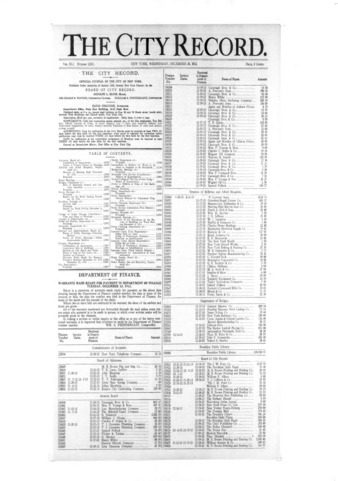 The City Record newspaper publishes notices which includes but is not limited to: public hearings and meetings, public auctions and sales, solicitations and awards and official rules proposed and adopted by city agencies. This is the City Record Newspaper for December 24, 1913.
