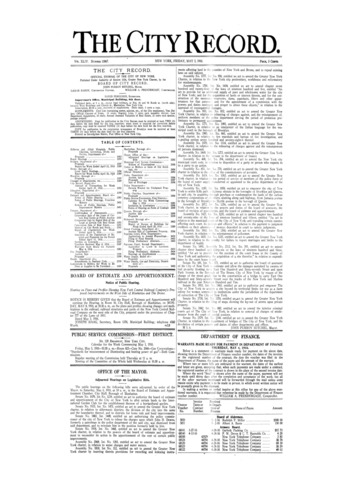 The City Record newspaper publishes notices which includes but is not limited to: public hearings and meetings, public auctions and sales, solicitations and awards and official rules proposed and adopted by city agencies. This is the City Record Newspaper for May 05, 1916.