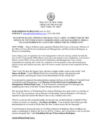 Mayor's Press Release: MAYOR DE BLASIO APPOINTS MICHAEL PAUL CAREY AS DIRECTOR OF THE OFFICE OF CITYWIDE EVENT COORDINATION AND MANAGEMENT, PRISCA SAL