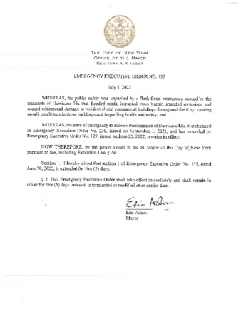 Emergency Executive Order No. 137, extends Emergency Executive Order No. 133, dated June 30, 2022, for five (5) days if this relates to Hurricane Ida.