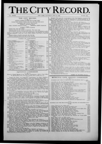 The City Record newspaper publishes notices which includes but is not limited to: public hearings and meetings, public auctions and sales, solicitations and awards and official rules proposed and adopted by city agencies. This is the City Record Newspaper for July 22, 1905.