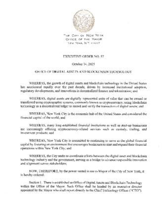 Executive Order 57, dated October 14, 2025, is being submitted as it relates to whereas the City seeks to coordinate efforts between digital asset and blockchain technology industry and government shall take effect immediately.