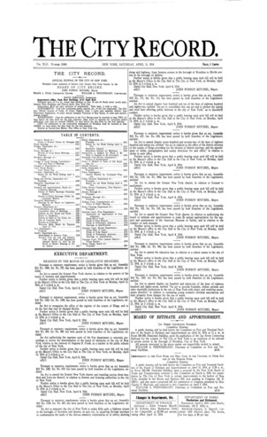 The City Record newspaper publishes notices which includes but is not limited to: public hearings and meetings, public auctions and sales, solicitations and awards and official rules proposed and adopted by city agencies. This is the City Record Newspaper for April 11, 1914.
