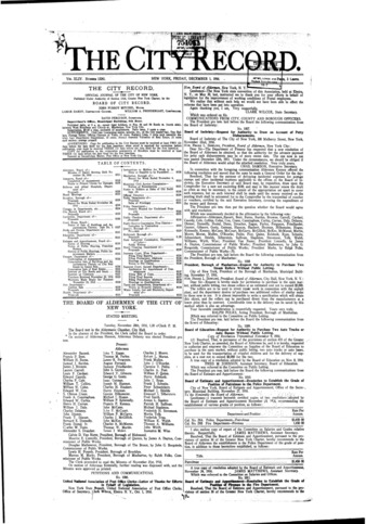 The City Record newspaper publishes notices which includes but is not limited to: public hearings and meetings, public auctions and sales, solicitations and awards and official rules proposed and adopted by city agencies. This is the City Record Newspaper for December 01, 1916.
