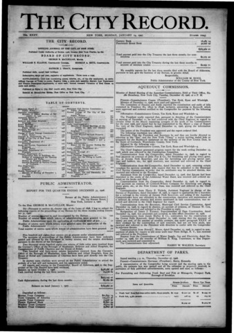 The City Record newspaper publishes notices which includes but is not limited to: public hearings and meetings, public auctions and sales, solicitations and awards and official rules proposed and adopted by city agencies. This is the City Record Newspaper for January 14, 1907.