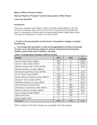 This report, submitted by the Mayor’s Office of Criminal Justice (MOCJ) to the City Council in compliance with Local Law 192 of 2019, serves as the tenth biannual report on closing jails on Rikers Island and opening jail facilities outside Rikers Island. The report covers data from 1/1-6/30/25.