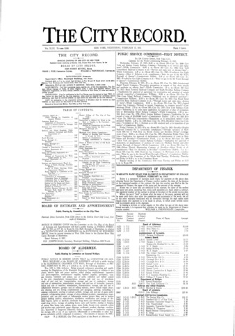 The City Record newspaper publishes notices which includes but is not limited to: public hearings and meetings, public auctions and sales, solicitations and awards and official rules proposed and adopted by city agencies. This is the City Record Newspaper for February 17, 1915.