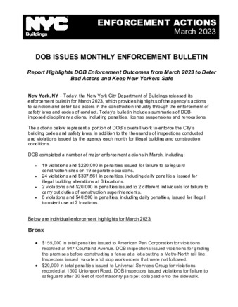 DOB releases Enforcement Bulletins each month that highlight the Agency's actions to sanction and deter bad actors in the construction industry through the enforcement of safety laws and codes of conduct for construction professionals.
