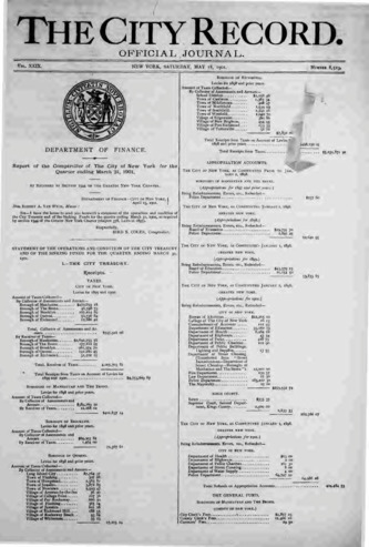 The City Record newspaper publishes notices which includes but is not limited to: public hearings and meetings, public auctions and sales, solicitations and awards and official rules proposed and adopted by city agencies. This is the City Record Newspaper for May 18, 1901.