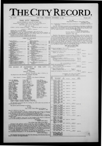 The City Record newspaper publishes notices which includes but is not limited to: public hearings and meetings, public auctions and sales, solicitations and awards and official rules proposed and adopted by city agencies. This is the City Record Newspaper for November 12, 1903.