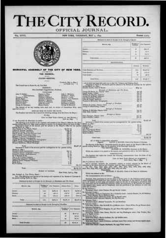 The City Record newspaper publishes notices which includes but is not limited to: public hearings and meetings, public auctions and sales, solicitations and awards and official rules proposed and adopted by city agencies. This is the City Record Newspaper for May 04, 1899.