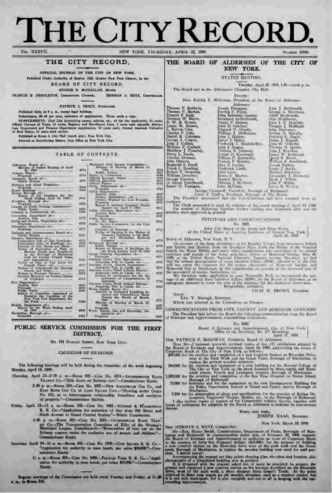 The City Record newspaper publishes notices which includes but is not limited to: public hearings and meetings, public auctions and sales, solicitations and awards and official rules proposed and adopted by city agencies. This is the City Record Newspaper for April 22, 1909.