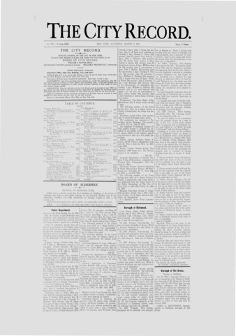 The City Record newspaper publishes notices which includes but is not limited to: public hearings and meetings, public auctions and sales, solicitations and awards and official rules proposed and adopted by city agencies. This is the City Record Newspaper for August 02, 1913.