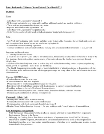 Mayor's Press Release: Bronx Legionnaires’ Disease Cluster Updated Fact-Sheet 8/5/15