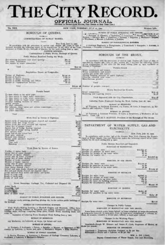 The City Record newspaper publishes notices which includes but is not limited to: public hearings and meetings, public auctions and sales, solicitations and awards and official rules proposed and adopted by city agencies. This is the City Record Newspaper for July 22, 1902.