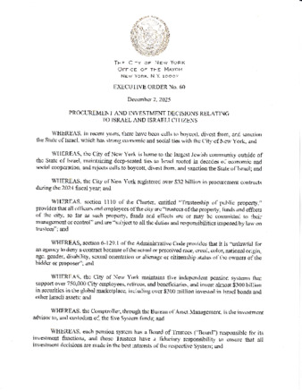 Executive Order No. 60, dated December 2, 2025, is being submitted as it relates to Procurement and Investment Decisions Relating to Israel and Israeli Citizens and shall take effect immediately.