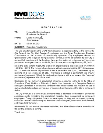 The Department of Citywide Administrative Services (DCAS) of New York Charter Mandated Quarterly Provisional Report 3/31/2021