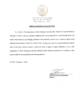 PROCLAMATION OF ELECTION dated February 5, 2026, as a result of the resignation of Erik Bottcher from the NYC Council effective Feb. 4, 2026, vacancy has been created in the seat he has held as Council Member for the 3rd Council district, hereby proclaim a special election on 4/28/2026.