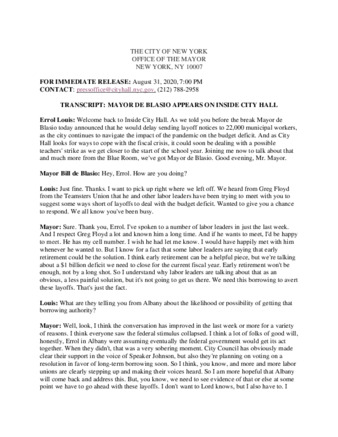 Mayor's Press Release: MAYOR DE BLASIO APPEARS ON INSIDE CITY HALL