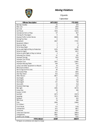 Pursuant to Admin Code Sect. 14-153(a), this monthly report contains 1) the number of moving violation summonses issued; 2) the number of traffic crashes; and 3) the number of traffic-related fatalities and injuries